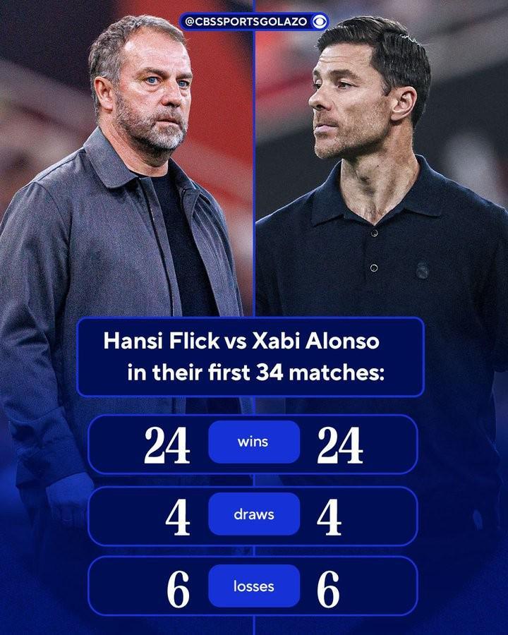 据统计,阿隆索执教皇马的战绩与弗里克执教巴萨的前34场比赛相同,均为24胜4平6负,但两人命运不同,阿隆索最终遭遇下课。