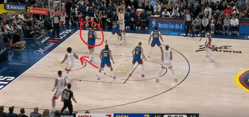 转换进攻掘金四打二,约基奇身后跟进,利用火箭两名退防人优先回收禁区,直接找到左侧外弹重新定位的约翰逊命中底角三分: